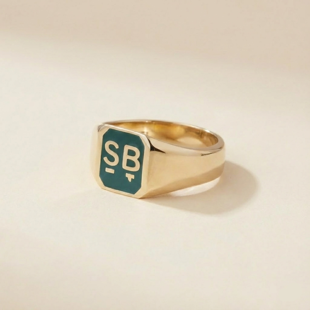 טבעת חותם לגבר עם כיתוב אישי במילוי אמייל צבעוני, נוכחת וגברית.